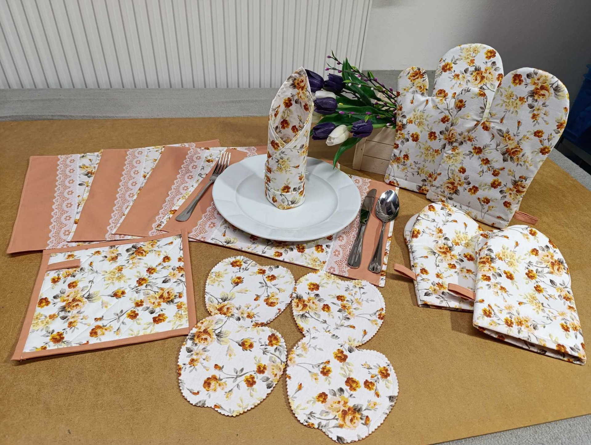 Utěrky ze 100% bavlněného piké jsou savé a odolné. Chňapky s termolinovou výplní zajistí bezpečí při manipulaci s horkými nádobami.